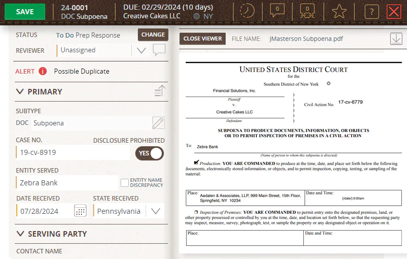 Legal solution is the first and only purpose-built system for subpoena response and account garnishment processing