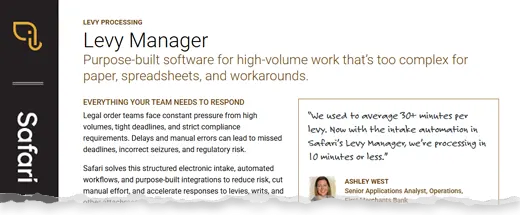 With Safari’s AI and Levy Manager automation, financial institutions can finally achieve "no-touch levies"